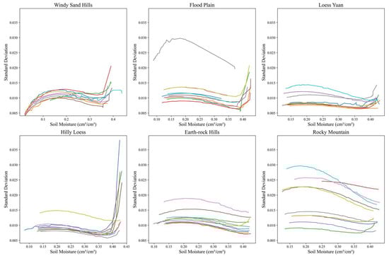 Using the MvG parameters and the mean and variance of each parameter, the standard deviation of SM that express the SM variability in each ERA5-Land grid were estimated with Equation (5). Typically, grids with complex soil textures correspond to larger standard deviations. We randomly selected ten grids in each geographic division to analyze their variability characteristics (Figure 3). Most of the grids show similar variation trends: at SM of 0–0.4 cm3/cm3, the standard deviations for SM increased and then decreased with increasing SM and peaked at about 0.2 cm3/cm3; when the SM was greater than 0.4 cm3/cm3, the variability in SM tended to increase significantly. This convex distribution and renewed growth trend were influenced by hydraulic parameters, and the variability was most sensitive to the pore size distribution parameter n [48], followed by f, θs, and α. In environments with homogeneous soil textures, sandy soils have a more uniform SM distribution due to larger pores and better water permeability, whereas clay soils are more prone to localized ponding or drying due to small water transport rates [77].