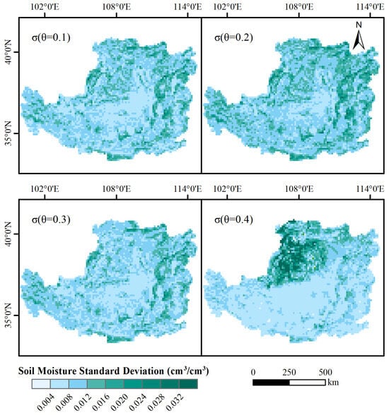 Figure 4 shows the SM variability distributions under specific SM (i.e., 0.1 cm3/cm3, 0.2 cm3/cm3, 0.3 cm3/cm3, and 0.4 cm3/cm3). Corresponding to the SM variability curves, the standard deviations for SM exhibited very similar spatial distribution characteristics at SM of 0.1 cm3/cm3 and 0.3 cm3/cm3; the standard deviations for SM were generally greater when the SM was 0.2 cm3/cm3. In terms of regional distribution, the Rocky Mountain subdivision has a diverse soil texture composition (Figure 1), and its variability under different SM conditions is higher (also confirmed in Figure 3). In contrast, the central Loess Hills region exhibited lower variability due to its single soil type composition, i.e., dominated by large, continuously distributed Loessial soil [78,79,80]. The above findings are similar to those of previous researchers [48,50,81], indicating that this SM variability estimation method had good applicability in the Loess Plateau and could be used as a basis for downscaling.