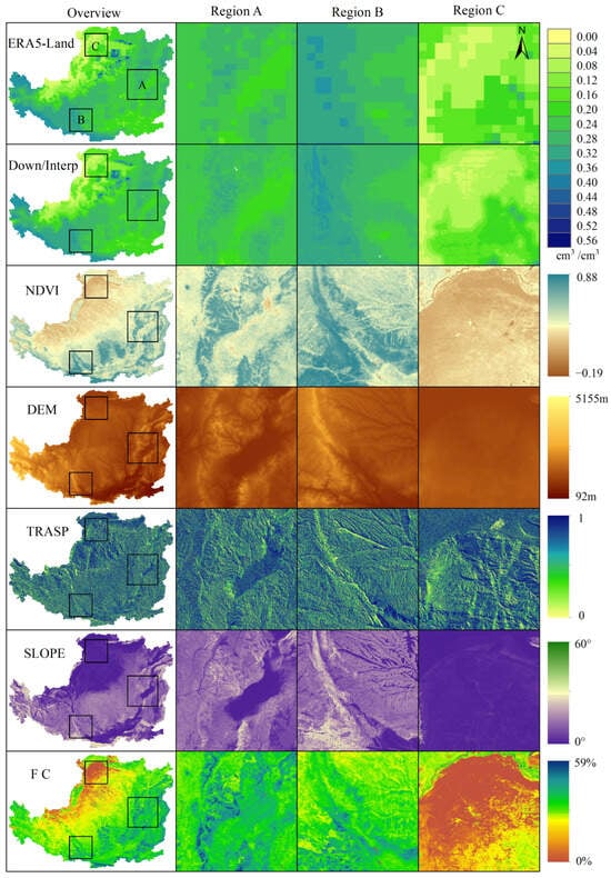 where is the high-resolution SM; is the ERA5-Land SM at a low resolution; is the standard deviation of the SM at the particular SM value; is the high-resolution auxiliary data; is the average value within a unit image element at a low resolution for the auxiliary data; and is the standard deviation of the auxiliary data within a unit image element at a low resolution. In Montzka’s study [50], Field Capacity (FC) was used for auxiliary data. However, FC is relatively stable and does not change significantly within a short period of time, and its values in spatially neighboring areas are usually close to each other, so the spatial detail information of the downscaled SM is relatively limited. In view of the good linear correlation between Apparent Thermal Inertia (ATI) and SM [71,72], Cao et al. [51] used dynamic ATI instead of FC for downscaling. In this study, we attempt to improve this method by adding several types of auxiliary data (NDVI, DEM, SLOPE, TRASP, and FC) to the downscaling process to obtain more accurate SM data.