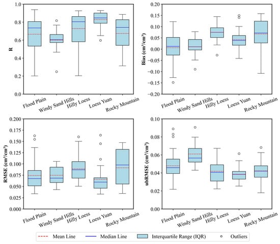Figure 7 compares the distribution of R, Bias, RMSE, and ubRMSE for sites in each geographical division (since there is only one site in the Earth-rock Hills, it was combined into Rocky Mountain for error statistics). In terms of R and ubRMSE, Loess Yuan possessed the highest R and the lowest ubRMSE with less dispersion, followed by Hilly Loess. This may be related to the fact that vegetation and topography in these two regions scored high in importance and possessed stronger correlations with SM, making the downscaled results closer to the measured SM.