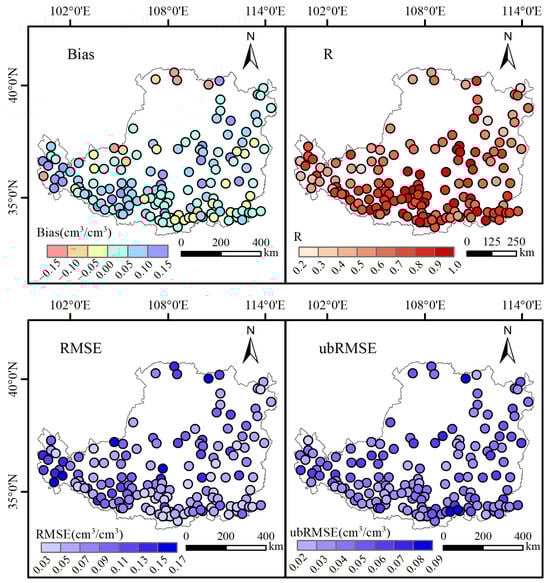 Figure 8 illustrates the spatial distribution of the validation results of the improved algorithm based on geographical division and interpolation. The correlation between downscaled and measured SM was overall high in the south and low in the north, and was broadly similar to the SM content spatial distribution. The correlation coefficients were greater than 0.7 at 92 sites and greater than 0.9 at 19 sites. Combined with the distribution of the mean bias, the downscaled results reveal underestimations of low-SM areas, most of which were distributed in the northwestern arid zone, while a few were located in the southeastern part of the Loess Plateau; additionally, the results reveal overestimations of high-SM areas, which were distributed mainly in the central and southwestern parts of the Loess Plateau. In addition, 89 sites had an RMSE less than 0.08 cm3/cm3, 106 sites had an ubRMSE less than 0.05 cm3/cm3, and, in general, the downscaled SM was able to satisfy the accuracy needs of the study area.