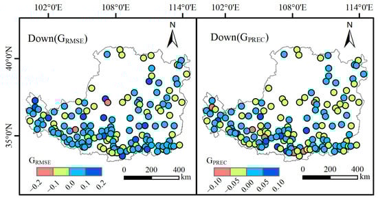 The gain distribution of the improved downscaling algorithm based on geographical division and interpolation (Figure 9) illustrated that most sites showed synergistic improvements in terms of the gains of RMSE and R. A small number of sites presented improved RMSE values, but decreased R values. Overall, the improvement in SM accuracy was greater in the southeastern and southwestern regions. Combined with the error distribution, the GRMSE gain was distributed mainly between RMSE of 0.07–0.17 cm3/cm3, which was able to reduce the higher RMSE, but there was no significant correlation between the GPREC and R distributions. The above validation results show that the improved downscaling algorithm based on geographical division and interpolation was superior to the traditional algorithm and could not only significantly increase the spatial resolution of ERA5-Land product, but also effectively improve its accuracy.