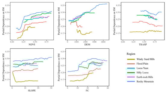 In order to clarify how the selected factors affect SM, we plotted the partial dependence of each factor in geographic subdivisions (Figure 10). The higher the importance of an environmental factor, the greater the slope of its corresponding curve, which was consistent with the results of the correlation analysis. When NDVI was less than 0.3, an increase in NDVI significantly enhanced SM; however, its effect slowed down when NDVI exceeded 0.4. This phenomenon reflected the limiting effect of SM on vegetation growth and the nutrient-supporting effect of increased vegetation on SM [86]. Adequate SM supports healthy vegetation growth, while increased vegetation rooting and surface cover enhance precipitation retention and infiltration, so higher NDVI generally corresponds to higher SM.