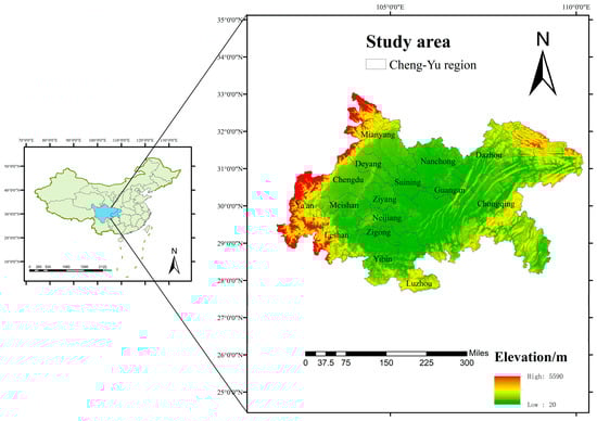 The Cheng-Yu region is one of China’s fastest-growing economic areas and a national model for new urbanization. It is primarily composed of the Cheng-Yu urban agglomeration, which centers on Chengdu and Chongqing (shortened to Yu in Chinese) as dual hubs. It encompasses 27 districts and counties in Chongqing and 15 cities in Sichuan Province. Covering an area of approximately 185,000 km2 and with a population of around 95 million, this region serves as an important demonstration area for advancing new-type urbanization in China. It is also a key platform for the Western Development Strategy and a strategic support for the Yangtze River Economic Belt [9]. The 2014 “Cheng-Yu Urban Agglomeration Development Plan” aimed to establish Cheng-Yu region as China’s fourth economic pillar and a crucial ecological barrier in the upper Yangtze River.