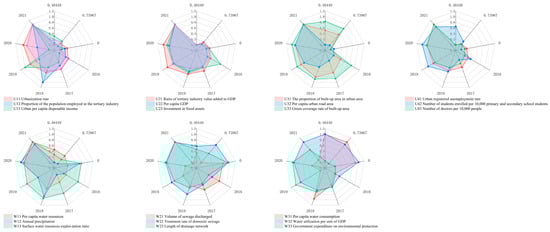 Based on the theoretical framework of urbanization and water environment governance, a comprehensive evaluation system was developed to quantitatively assess UDS and WEGS in the Cheng-Yu region (Table 2). UDS encompasses four dimensions: population, economy, spatial structure, and society, with 14 representative indicators. WEGS consists of nine key indicators across three dimensions: water endowment, prevention and control of water pollution, and water conservation. The distribution and trend of indicators in the subsystem are shown in Figure 2. The selection of these indicators is grounded in relevant literature and practical applicability [34,35]. Weightings for each indicator were determined through entropy weighting to ensure the scientific robustness and reliability of the evaluation system.