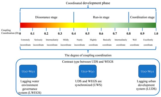 The coupling degree C is calculated as (9) in Table 3. The coupling degree alone does not capture the extent of harmonious development, so the coupling coordination degree D is introduced [43]. Its calculation formula is shown in (10). T is the composite evaluation index of UDS and WEGS. The coupling coordination degree D ranges from 0 to 1, where higher values indicate better coordination [44,45]. Based on D, the study classifies the relationship between UDS and WEGS into 10 stages, from extreme incoordination to excellent coordination. Simultaneously, this study is divided into three contrast types based on the magnitude relationship between UDS and WEGS (Figure 3).