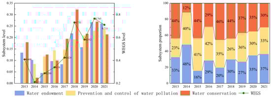 According to entropy weight calculations (Table 2), water conservation (weight 0.41) had the greatest influence on the comprehensive level of WEGS, followed by prevention and control of water pollution (0.32) and water endowment (0.27). The WEGS index showed S-shaped growth from 0.409 in 2013 to 0.711 in 2021, despite minor declines in 2014 and 2021 (Figure 5).