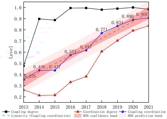 Using the coupling coordination model, the coupling degree between UDS and WEGS in the Chengdu–Chongqing region steadily increased from 2013 to 2021 (see Figure 6). The coupling degree rapidly rose from 0.57 in 2013 to 0.96 in 2014. After a slight decline in 2015, it remained at a high level throughout the rest of the period. The coordination degree showed a steady increase, rising from 0.27 in 2013 to 0.84 in 2021. Simultaneously, the coupling coordination degree also steadily increased from 0.394 in 2013 to 0.897 in 2021, shifting from “mildly incoordinate” to “excellently coordinate”. In 2014, supported by national policies, Sichuan Province implemented stringent water resource management policies, which significantly boosted the coupling degree. However, between 2013 and 2015, slow urbanization progress led to a slower increase in coupling coordination. After 2018, the coupling coordination degree stabilized at a higher level, but its growth rate slowed, indicating that the relationship between urbanization and water management had entered a more mature stage.