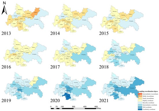 Applying the coupling coordination model, the spatial coupling relationship between UDS and WEGS across 16 cities in the Cheng-Yu region from 2013 to 2021 was calculated. Using ArcGIS 10.8 to map the spatial changes in coupling coordination (Figure 8), it becomes clear that significant spatial disparities exist among the cities.
