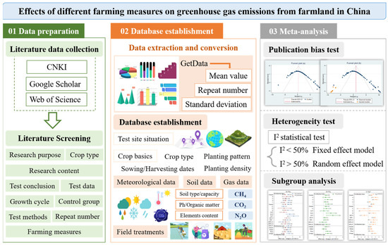 To further exclude unqualified literature, reduce publication bias in the meta-analysis results [22], ensure statistical significance, and improve the accuracy of the conclusions, the following criteria were established for selecting the literature in this study: (i) the study area must be located in mainland China, with clearly defined locations and experiment start and end dates; (ii) the experiment must be consistent in conditions and conducted in the field, excluding monoculture experiments; (iii) the experimental design must include both a control group and an experimental group with consistent treatments; (iv) replicated experiments must be used; (v) the experiment must span at least one full growing season of the crop (from planting to harvest); (vi) cumulative gas emissions must be directly provided or calculable from gas emission fluxes and the number of crop growth periods; (vii) the reported data must include at least one of the cumulative emissions of CH4, CO2, or N2O, provided in numerical or graphical form along with mean values, standard deviation (or error), and sample size (number of replicates). Based on these criteria, this study finally screened 82 valid experimental research articles for inclusion in the meta-analysis. Of these, 34 articles focused on fertilization measures, 22 on tillage measures, and 32 on straw returning in relation to CH4 emissions; 24 on fertilization measures, 9 on tillage measures, and 17 on straw returning in relation to CO2 emissions; and 45, 27, and 37 articles on fertilization, tillage, and straw returning in relation to N2O emissions, respectively. The technical roadmap of this study is shown in Figure 1.