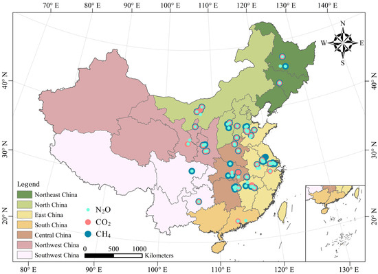Grain cultivation in China is widely distributed, with rice primarily grown south of the Qinling Mountains and the Huaihe River, wheat mainly cultivated in the North China Plain and Northeast China Plain, and maize predominantly planted in the northeast, north, and southwest regions. Grain cultivation in China is widely distributed, with rice primarily grown south of the Qinling Mountains and the Huaihe River due to the region’s warm, humid climate and abundant water resources. Wheat is mainly cultivated in the North China Plain and Northeast China Plain, where cooler temperatures and moderate rainfall are suitable for its growth. Maize is predominantly planted in the northeast, north, and southwest regions, which provide diverse climatic conditions and sufficient sunlight for maize cultivation. Farming measures differ across regions and crop types, making it necessary to analyze the characteristics of greenhouse gas emissions from farmland and their influencing factors in China’s main grain-producing areas through comprehensive meta-analysis. This analysis aims to provide a scientific basis for formulating rational greenhouse gas emission reduction measures in farmland. Figure 2 presents a map of the distribution of research sites included in this study.