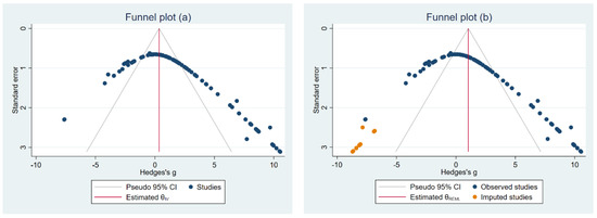 Publication bias test funnel plot. The results of the publication bias test are presented in (a). In this figure, the red line represents the combined effect size, the gray diagonal line indicates the 95% confidence interval, and the blue points depict the scatter of each study’s effect size against its standard deviation. Asymmetry in the lower left corner of the funnel plot was observed and corrected using the shear-and-patch method. The corrected results are shown in (b).