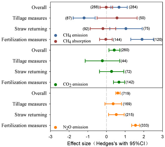 Effects of different farming measures on greenhouse gas emissions from farmland. The vertical gray line represents the effect value Hedges’s = 0, the error bar represents the 95% confidence interval (95% CI), and the number in brackets represents the sample size.