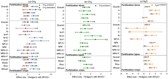 Effects of different fertilization measures on greenhouse gas emissions from farmland. The vertical gray line represents the effect value Hedges’s = 0, the error bar represents the 95% confidence interval (95% CI), and the number in brackets represents the sample size.