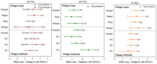 Effects of different tillage measures on greenhouse gas emissions from farmland. The vertical gray line represents the effect value Hedges’s = 0, the error bar represents the 95% confidence interval (95% CI), and the number in brackets represents the sample size.