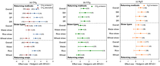 Effects of different returning measures on greenhouse gas emissions from farmland. The vertical gray line represents the effect value Hedges’s = 0, the error bar represents the 95% confidence interval (95% CI), and the number in brackets represents the sample size.
