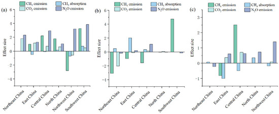 Fertilization did not significantly affect CH4 uptake across the different regions (ES = −0.036, 95% CI [−0.346, 0.274]), as the 95% confidence interval overlapped with 0; therefore, no regional analysis for CH4 uptake will be discussed further. The analysis shown in Figure 8a indicates that fertilization significantly increased CO2 (ES = 1.812) and N2O (ES = 2.304) emissions in Northeast China. In East China and Central China, fertilization positively impacted greenhouse gas emissions (CH4, CO2, N2O), but with varying magnitudes: East China had effect sizes of 0.993 for CH4, 1.164 for CO2, and 1.282 for N2O, while Central China had effect sizes of 2.202 for CH4, 0.718 for CO2, and 2.93 for N2O. In North China, fertilization similarly increased CH4 (ES = 1.782), CO2 (ES = 0.614), and N2O (ES = 1.036) emissions. In Northwest China, fertilization suppressed CH4 (ES = −2.804) and CO2 (ES = −0.575) emissions but increased N2O (ES = 3.197) emissions. Fertilization also positively affected CH4 (ES = 3.246), CO2 (ES = 0.468), and N2O (ES = 3.841) emissions in Southwest China.