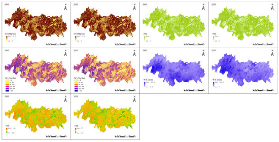 Spatial distribution of ESs from 2000 to 2020. Abbreviations: CS: carbon storage; WY: water yield; SC: soil conservation; HQ: habitat quality; TES: total ecosystem services.