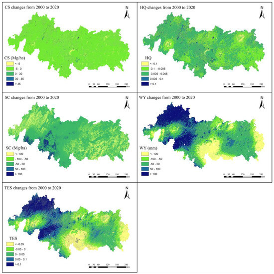 Spatial distribution of changes in ESs from 2000 to 2020. Abbreviations: CS: carbon storage; WY: water yield; SC: soil conservation; HQ: habitat quality; TES: total ecosystem services.