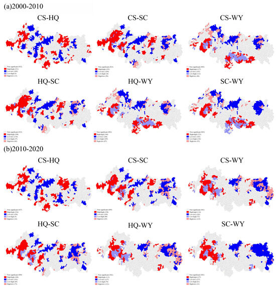 Subsequently, GeoDa 1.14.0.0 software was used to perform a bivariate local spatial autocorrelation analysis, with the objective of visualizing the relationship among ESs, and the outlets were divided into five categories: high–high synergy and low–low synergy, low–high and high–low trade-offs, and insignificant [29].