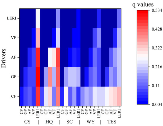 Geodetector is an effective tool for identifying potential drivers of spatial heterogeneity in ESs, with the calculated q value in the range of [0, 1] [30]. A larger q value indicates a higher explanatory power [13,16].