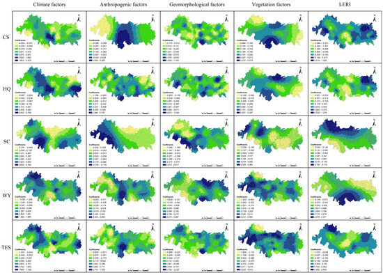 The adjusted R2 reflected the explanatory power of the drivers on the changes in ESs [33]. In the MGWR model, the explanatory power of the selected drivers on CS, HQ, SC, WY and TES was 50.6%, 64.9%, 54.4%, 61.3% and 87.9%, respectively. It can be seen that the changes in CS are mainly influenced by LERI, and there is a significant negative correlation between the two (Figure 5 and Figure 6). HQ was mainly influenced by geomorphological factors, anthropogenic factors and LERI. There was a positive correlation between HQ and geomorphological factors, with the highest correlation coefficient distributed in the central north, northeast, southwest and central south. The relationship between HQ and anthropogenic factors was mainly negatively correlated, with the highest correlation coefficient in the northeast. HQ and LERI were negatively correlated overall, with spatial differences in their distribution. They were positively correlated in the northeast and negatively correlated in the central regions, with the highest correlation coefficient in the northeast. The impact of geomorphological factors on SC was negatively correlated with the highest correlation coefficient in the northwest. The main factors affecting WY were those for climate and vegetation. The relationship between WY and climate factors was generally positively correlated, with spatial differences in distribution. It was positively correlated in the western region and negatively correlated in the central and southern regions. The relationship between WY and vegetation factors was mainly negatively correlated, and the region with the highest correlation coefficient was located in the northwest. The changes in TES were mainly influenced by climate factors, anthropogenic factors and LERI. TES was negatively correlated with anthropogenic factors overall but positively correlated in the central and southern regions. The relationship between TES and LERI was mainly negatively correlated, with a positive correlation in the northeast and northwest regions. TES was mainly positively correlated with climate factors, with the highest correlation coefficient located in the northwest and central-eastern parts of the study area and a negative correlation relationship in the central-southern region.