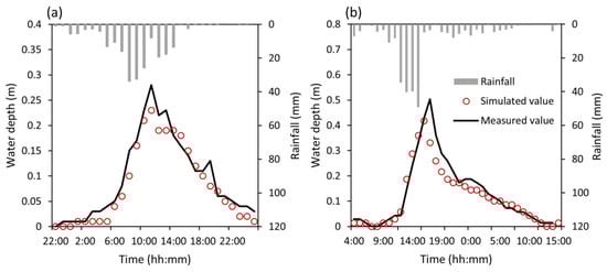 Comparison of observed and simulated water depths with rainfall hyetographs for calibration and validation periods at point A107. (a) Calibration period (7 May–9 May 2022); (b) Validation period (4 August–5 August 2022).