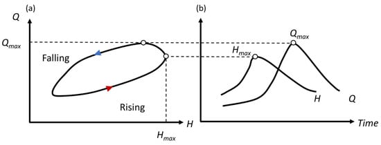 Illustration of the time-lag effect between water level and flow rate. (a) Hysteresis curve (H–Q curve) showing the dynamic relationship between water level and flow rate, with the area reflecting the time-lag effect; (b) hydrological process lines demonstrating the asynchrony between flow rate and water level. Note: The red arrow indicates the rising phase of the flow process, while the blue arrow represents the falling phase.