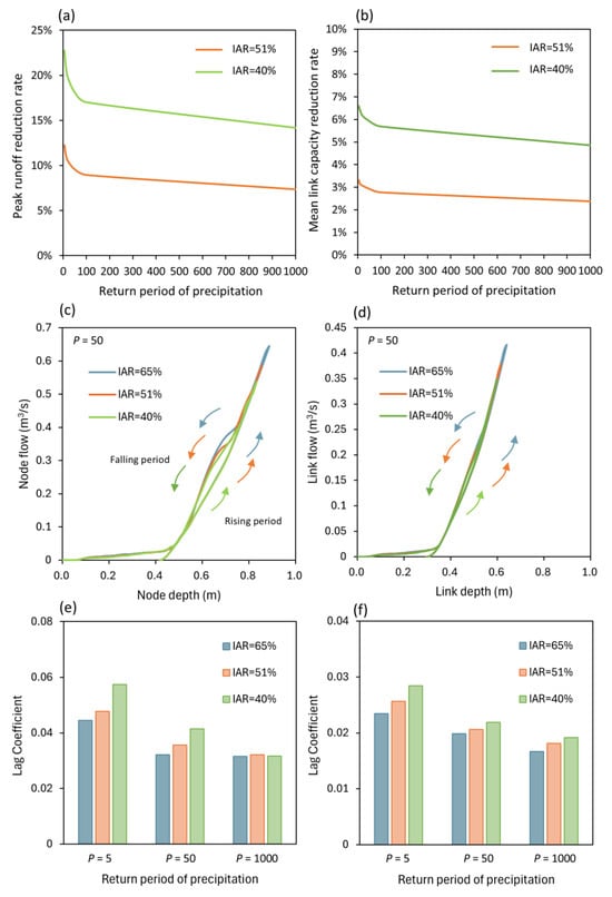 Figure 4e,f show the variations in lag coefficients for nodes and pipes under different rainfall recurrence intervals (P = 5, P = 50, P = 1000). A larger lag coefficient indicates a stronger ability of the system to reduce peak runoff and delay drainage. At the node level, high permeability conditions (IAR = 40%) exhibit significantly higher lag coefficients across all recurrence intervals compared to medium and low permeability conditions (IAR = 51%, 65%). For example, under P = 5 conditions, the node-lag coefficient for IAR = 40% is 0.06, while for IAR = 65%, it is only 0.04. As rainfall intensity increases, the lag coefficient decreases; however, under extreme rainfall scenarios (P = 1000), differences in lag coefficients across permeability conditions become negligible. The lag effect for pipes follows a similar trend to nodes but is generally weaker, indicating a relatively lower peak reduction and lag capability.