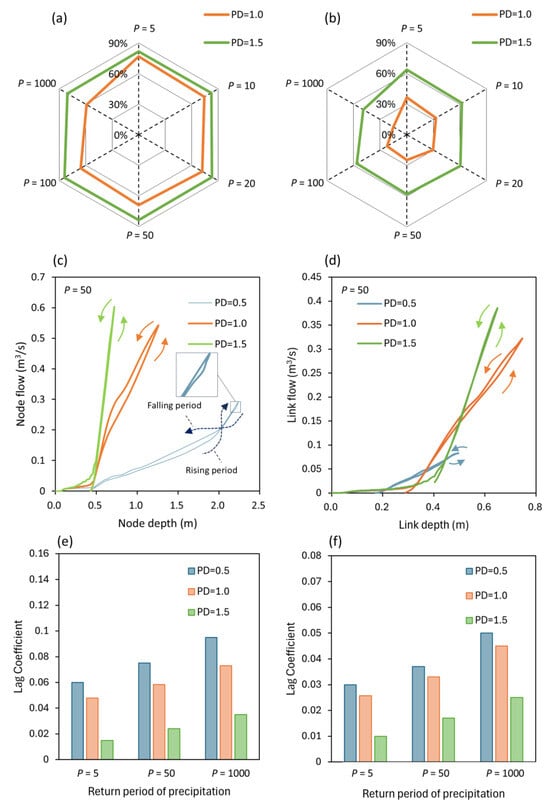 Figure 5e,f show the variation in lag effects for nodes and pipes, as reflected by the hysteresis curve area. The results indicate that nodes generally exhibit stronger lag effects than pipes. Lag effects decrease as rainfall recurrence intervals increase, with the hysteresis curve area shrinking significantly under extreme rainfall conditions (P = 1000). Under different pipe diameter conditions, PD = 0.5 m exhibits the most pronounced lag effects, with the largest hysteresis curve areas for both nodes and pipes, especially under small-to-medium rainfall conditions (P = 5 and P = 50). PD = 1.0 m shows moderate lag effects, while PD = 1.5 m exhibits the weakest lag effects, with almost no lag observed under extreme rainfall scenarios (P = 1000). These findings indicate that smaller pipe diameters (PD = 0.5 m) offer stronger peak reduction and lag effects but have relatively low drainage efficiency. In contrast, larger pipe diameters (PD = 1.5 m) significantly enhance drainage capacity, making them more suitable for high-intensity rainfall events, though they may increase downstream drainage pressure.