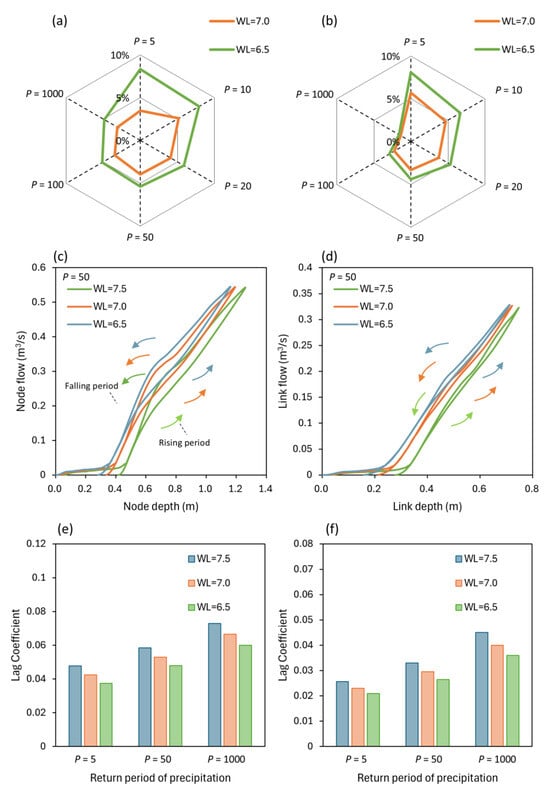 Figure 6e,f show the variations in lag coefficients for nodes and pipes under different rainfall recurrence intervals. Nodes generally exhibit stronger lag effects than pipes, with lag effects increasing substantially with longer recurrence intervals. At the node level (Figure 6e), under WL = 7.5 m, the lag coefficients for P = 5, P = 50, and P = 1000 are approximately 0.06, 0.08, and 0.10, respectively. When the outlet water level is reduced to WL = 7.0 m, the coefficients decrease to approximately 0.05, 0.07, and 0.08. Under WL = 6.5 m, they further decrease to approximately 0.04, 0.06, and 0.07. At the pipe level (Figure 6f), the lag effects are slightly weaker than at the node level but follow a similar trend. Under WL = 7.5 m, the lag coefficients for P = 5, P = 50, and P = 1000 are approximately 0.03, 0.04, and 0.07, respectively. These values decrease to 0.025, 0.035, and 0.06 under WL = 7.0 m and further to 0.02, 0.03, and 0.05 under WL = 6.5 m. These findings indicate that lowering the outlet water level significantly reduces lag effects for both nodes and pipes, with the impact being more pronounced for nodes.