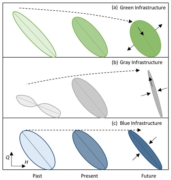 Impact of green, gray, and blue infrastructures on the hysteresis curve across scenarios. (a) Green infrastructure-induced changes in hysteresis curve morphology; (b) Gray infrastructure-induced changes in hysteresis curve morphology; (c) Blue infrastructure-induced changes in hysteresis curve morphology. Note: The solid arrows indicate the direction of hysteresis curve changes over time, while the dashed arrows represent the overall evolutionary trend of the infrastructure across different periods.