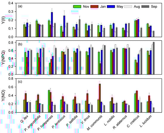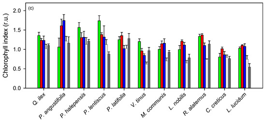 - Baquedano, F.J.; Castillo, F.J. Drought tolerance in the Mediterranean species Quercus coccifera, Quercus ilex, Pinus halepensis, and Juniperus phoenicea. Photosynthetica 2007, 45, 229–238. [Google Scholar] [CrossRef]