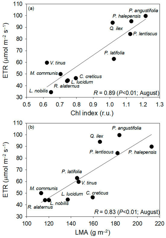 - Gratani, L.; Varone, L. Adaptive photosynthetic strategies of the Mediterranean maquis species according to their origin. Photosynthetica 2004, 42, 551–558. [Google Scholar] [CrossRef]
