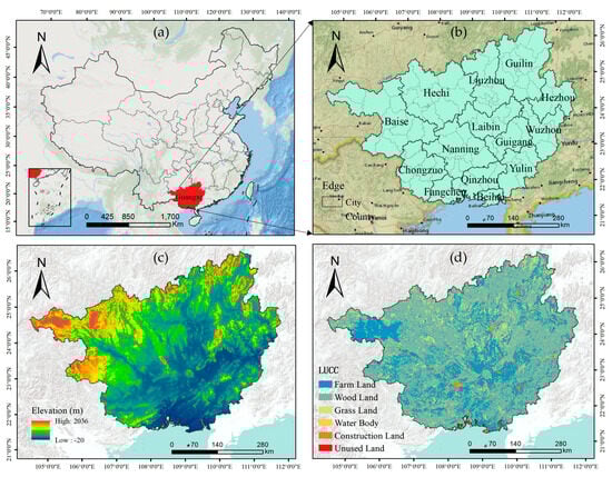 Guangxi (104°26′ E~112°04′ E, 20°54′ N~26°24′ N) is located in the karst region of southern China. It comprises 14 prefecture-level cities and 111 districts and counties. The region had a permanent population of 50.1268 million in 2020. The total land area is 237,600 km2. Mountains, hills, and basins are extensively distributed throughout the area, resulting in complex topography and geomorphology. It is characterized by the typical interlacing of mountains, seas, and land. The terrain is higher in the northwest and lower in the southeast, with an average elevation of 395 m (Figure 1). Guangxi is located in the subtropical monsoon climate zone; the type of land use is dominated by woodland, farmland, and grassland, with a forest coverage rate of 62.55%. In recent years, driven by policies, Guangxi has undergone a rapid transformation in industrialization and urbanization, leading to significant changes in the spatial evolution of the region’s land. Consequently, the TSFs relationships have become increasingly complex.