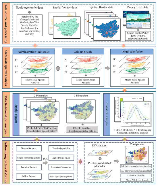 This study takes Guangxi, a southern karst region, as the research object and 2020 as the research time node. First, a multi-scale fusion (MSF) model is constructed based on administrative and grid unit scales. The administrative unit scale measures data primarily using statistical data through a weighted summation measurement method based on an index system. The grid unit scale measures data primarily using spatial data through an area-weighted summation method with a 4 km × 4 km grid. In the multi-scale fusion phase, we specifically employed two strategies. One strategy involved extracting key features from the grid unit scale and progressively integrating them with the administrative unit scale, with the aim of preserving spatial details and overall trends. This approach is primarily used for precise “macro-micro” analysis of TSFs. The other strategy involved a comprehensive evaluation based on area-weighted summation, which is mainly used to identify the coordination of TSFs across multiple dimensions and levels. Secondly, the influencing factors are selected according to the study area’s natural geographic characteristics and socio-economic status. The principal component analysis is applied to identify the comprehensive and composite types of the influencing factors. The Revealed Comparative Advantage index is adopted to identify the advantageous influencing factors of the districts and counties. Finally, according to the type of coordination, advantageous influencing factors for the TSFs zoning should be put forward, as well as scientific and precise regional optimization countermeasures. These steps are mainly completed in ArcGIS 10.7 and SPSS 26 (Figure 2).