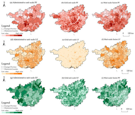 Spatial pattern of TSFs (PF, LF, EF). (a,d,g) Spatial pattern of TSFs at administrative unit scale; (b,e,h) Spatial pattern of TSFs at grid unit scale; (c,f,i) Spatial pattern of TSFs at multi-scale fusion.