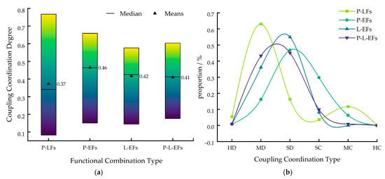(a) The distribution interval, median line, and mean value of the coupling coordination degree for functional combinations; (b) The evolution curve of coupling coordination type proportions for functional combinations.