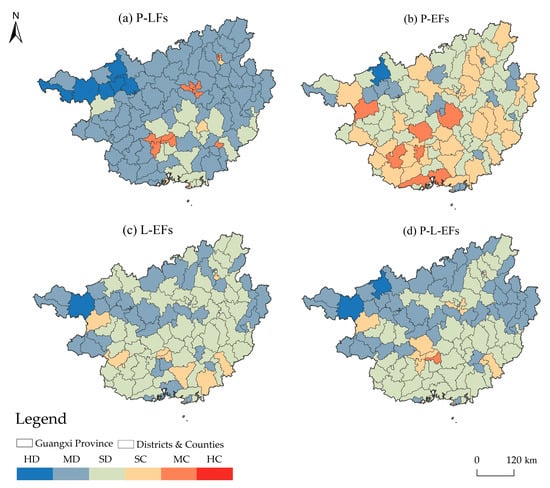 Figure 5a–d illustrates the spatial pattern characteristics of TSF relationships. In the P-LFs relationship, the proportion of moderate disorder is the highest, 63.06%, and widely distributed in the whole study area; High Disorder is distributed in the mountainous counties of Baise in the northwestern part of Guangxi; moderate disorder and slight disorder are mainly distributed in the central and southern parts of Guangxi around the central urban areas; slight and moderate coordination is mainly distributed in the urban areas of Guilin, Liuzhou, and Nanning. In the P-EFs relationship, slight disorder accounts for the highest proportion of 46.86% and is widely distributed with slight coordination in the counties around the central urban areas; high disorder and moderate disorder are sporadically distributed in the northern karst mountainous counties and the central urban areas of Guilin, Liuzhou, Yulin, and Beihai; moderate coordination is mainly distributed in the central urban areas of Nanning, Baise, Laibin, Qinzhou, and Fangcheng. In the L-EFs relationship, the proportion of slight disorder is the highest, 54.95%, and is widely distributed in Guangxi; slight coordination is mainly distributed in the urban areas of Nanning, Guilin, and Baise, as well as in some of the counties of Chongzuo, Qinzhou, and Baise. In the P-L-EFs relationship, slight disorder accounts for a higher proportion of 45.05% and is distributed in the central and southern regions in clusters; high disorder and moderate disorder are similar to the spatial pattern of L-EFs and show an expanding trend; slight coordination and high coordination are mainly distributed in the central urban areas of Nanning, Liuzhou, Guilin, Yulin, Beihai, and Hechi.