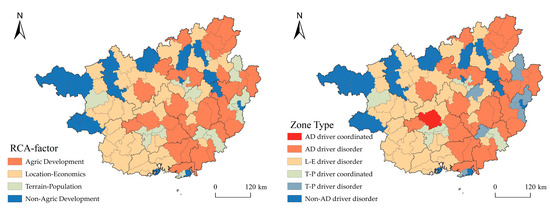 - Non-Agricultural Development (Non-AD) driver disorder zone: the type accounts for 15.32% and is sporadically distributed in the karst mountainous counties along the western and central boundaries, as well as in some central urban areas. The terrain conditions in the karst mountainous areas are generally moderate. In recent years, under the policy guidance of rural revitalization, large-scale infrastructure investment has flowed into the region, promoting the development of non-agricultural production functions. In contrast, the central urban areas have an advantage in the secondary and tertiary industries.