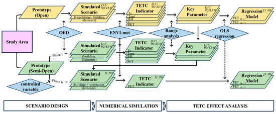 Figure 1 illustrates the research process of this study which mainly consists of three parts: scenario design, numerical simulation, and TETC effect analysis. In the scenario design part, first, two prototypes (Open and Semi-Open) were extracted from the waterfront districts on both sides of the central urban section of the Huangpu River in Shanghai, based on the morphology and layout characteristics of the landscape elements. This step is to ensure the parameterized models built based on the prototypes in the numerical simulation are closer to the real spatial form of the riverside districts. Next, the simulated scenarios were built based on the Open (O) type and Semi-open (SO) type, respectively. In particular, the SO-type simulation scenarios were developed in two phases due to the large number of element forms involved. In phase Ⅰ, the simulation scenarios were constructed only by building elements. After obtaining the key parameters of the vegetation and building elements, formal SO-type scenarios are constructed in phase II for further analysis.