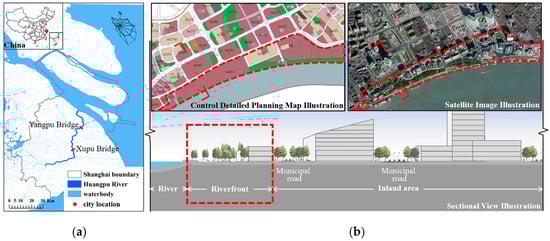 For the purpose of this study, the riverfront is defined as the area extending landward from the riverbank to the first municipal road (parallel to the riverbank) (Figure 2b). The riverside districts within this area often exhibit highly heterogeneous thermal environmental features due to the profound influence of the nearby river as well as the distinct spatial morphology. Moreover, this area has relatively independent planning and construction conditions, thus requiring targeted studies.