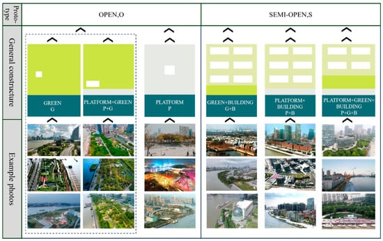 After summarizing the morphology of the standard section of the waterfront zone on both sides of the Huangpu River, two primary spatial structures were identified (Figure 3): one is open space (OPEN, O) type, which can be further divided into type of open green space and type of open square. There may also be building works in these two kinds of spaces, but the volume and number are relatively small. The other is semi-open space (SEMI-OPEN, SO) type, characterized by open green spaces, squares, or impermeable platforms along the riverbank, with residential neighborhoods or office clusters located further inland. The distinct spatial structures of O and SO types result in significantly different thermal performances, prompting separate discussions in previous studies.