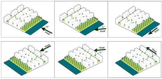 In addition, considering that changes in the shoreline orientation may also cause differences in the thermal environment of the riverside districts, each scenario was configured in three directions to examine the situation where the angle between the shoreline and the direction of the incoming wind is 90°, 45°, and 0°, respectively. Each angle includes two locations—upwind (U) and downwind (D)—resulting in a total of 150 scenarios for both O and SO types (Figure 5).