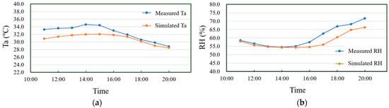 Hourly measured and simulated (a) Ta and (b) RH from 11:00 to 20:00.
