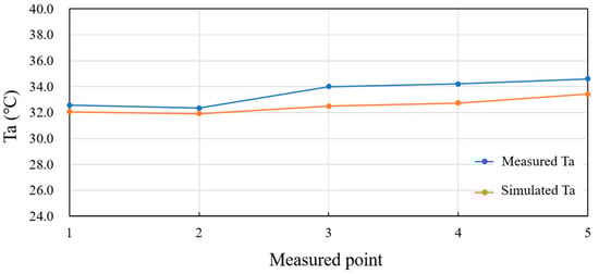 Figure 7 illustrates the comparison between measured and simulated Ta values at the mobile measurement points at 14:00 on the same day. The results indicate that the simulated Ta is slightly lower than the measured value at that time. Generally, the trend of both simulated and measured values is consistent among measurement points, showing a gradual increase in Ta as the points move closer to the riverbank, with the simulated results exhibiting a smoother trend. These findings suggest that ENVI-met demonstrates good sensitivity to Ta variations in diverse environments within riverfront areas.