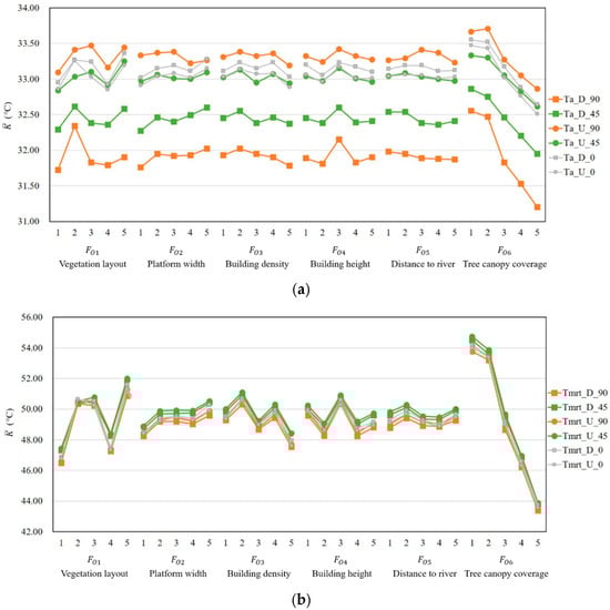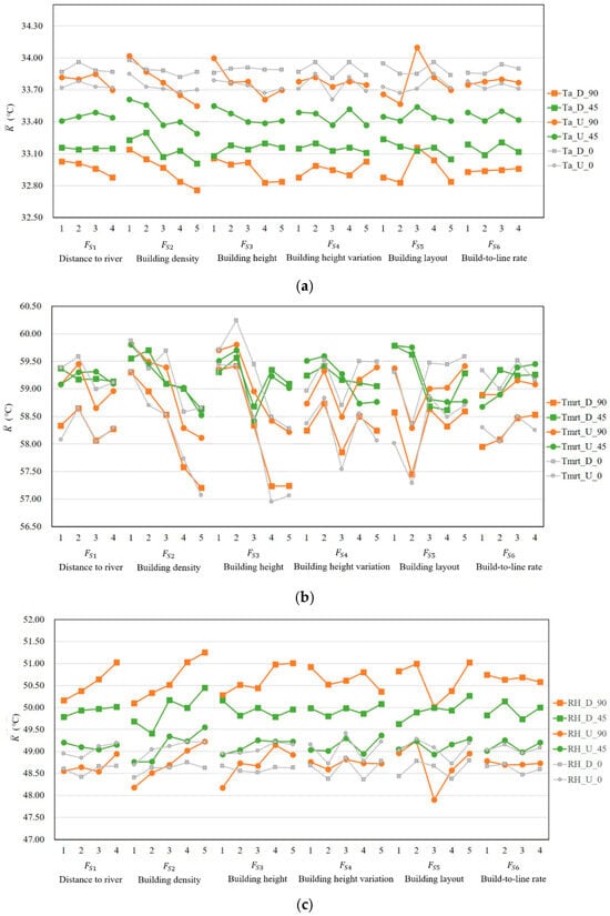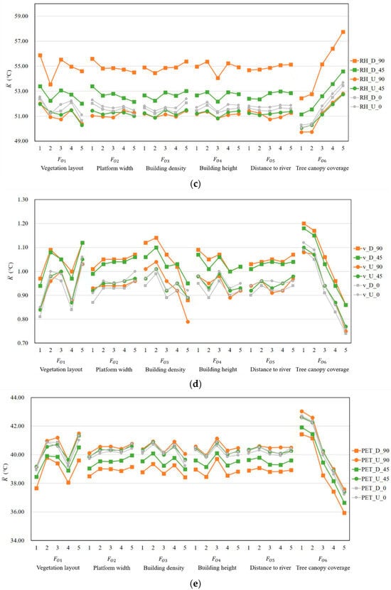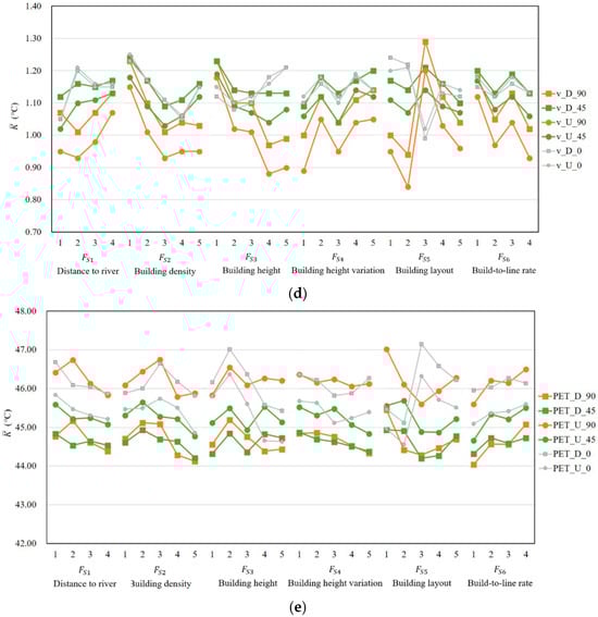 In addition to the comparison through the R value, this study also adopted the mean value graph commonly used in the range analysis to show the average value of the simulated meteorological parameters and thermal comfort index, i.e., the value of each factor at each level, which is calculated as shown in Equation (4). The mean value graph can intuitively display the trend of the average value of each factor at different levels, which can be combined with the factor’s range, R, to analyze the factor’s impact on the TETC.