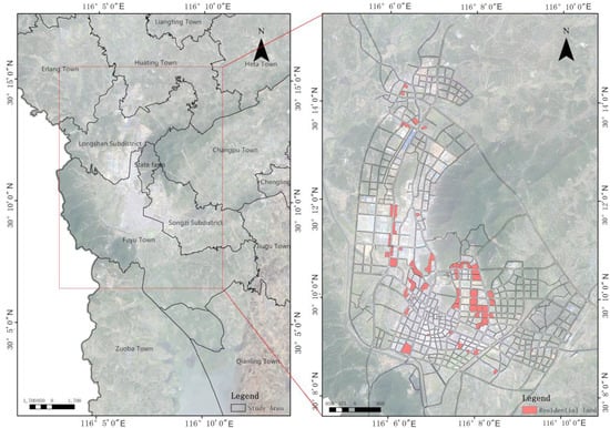 This study selected the central urban area of Susong County of Anhui Province as the research area. The county, located in the southwest of Anhui Province at the junction of the Anhui, Hubei, and Jiangxi provinces and having a history of about 1000 years, possesses a typical climate characteristic of hot summers and cold winters. By combining indicators such as the construction time of residential land, the number of households (NOH), the size of the residential land area (LA), and the FAR, 84 typical residential land samples within the central urban area of the county were selected. To make the survey samples more representative, the selected residential land was of various types, including old residential areas, affordable housing, resettlement housing, and large residential communities, which have diverse built environmental characteristics. This provides a certain level of representativeness for studying the relationship between residential land CEs and construction environmental factors as well as predicting residential land CEs. The distribution of residential land samples in the study area is shown in Figure 1.