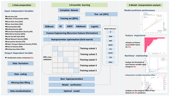 In recent years, the advantages of machine learning (ML) in handling multi-dimensional data have been continuously verified, and the modeling results are often more scientific and accurate. It can compensate for the deficiencies of mathematical models and, therefore, is widely used by scholars in carbon emission prediction models in different fields. Commonly used ML models include support vector machine (SVM) [22,23,24,25], random forest (RF) [26,27], extreme gradient boosting (XGBoost) [28,29,30,31,32,33,34,35], gradient boosting decision tree (GBDT) [36], and back propagation (BP) [37,38]. Among them, in the XGBoost model, as an improved algorithm of GBDT, regularization rules have been incorporated to mitigate the risk of overfitting, which significantly reduces model prediction errors by optimizing the algorithm sequence and integrating decision trees [39]. The XGBoost model excels in handling nonlinear relationships and complex interactive effects in spatially heterogeneous data, offering advantages such as a fast computation speed, high accuracy, and strong robustness. It has been widely applied in various fields such as transportation CE prediction [40], automobile CE prediction [41], user behavior prediction [42], and heart disease risk prediction [43,44]. However, the “black box” nature of the XGBoost model makes its solution process opaque, making it difficult to explain the importance of various influencing factors. To address this issue, Shapley Additive exPlanation (SHAP) values, as an interpretability tool for ML models, have been widely used in feature importance analysis in recent years. By fairly allocating variable contributions, SHAP values can effectively identify key features and explore relationships between variables, offering excellent visualization effects. Scholars such as Santos R M [45], Alireza F [46], Shi W [47], Li Yangtao [41], Wang Zhijiang [48], and Yang Dongfeng [49] have successfully introduced SHAP values into fields such as transportation CE prediction and user behavior analysis for quantitative analysis of the contribution of features to prediction results. For instance, Li Yangtao et al. uncovered the critical factors influencing vehicle CEs by utilizing SHAP values in conjunction with the XGBoost model [41]. Wang Zhiqiang et al. employed SHAP values to scrutinize the individual and interactive effects of multiple features on CEs during the building design phase [48]. Yang Dongfeng et al. utilized SHAP values to investigate the nonlinear correlation between the built environment and street vitality as well as the interactive effects among various built environment elements [42]. SHAP values possess advantages, such as the strong global and local interpretability of variables, the fair allocation of variable contributions, and excellent visualization effects, compensating for the poor interpretability of tree-based models such as decision trees and RF. However, there has been little research on using the XGBoost model combined with SHAP values to carry out CE prediction for residential land.