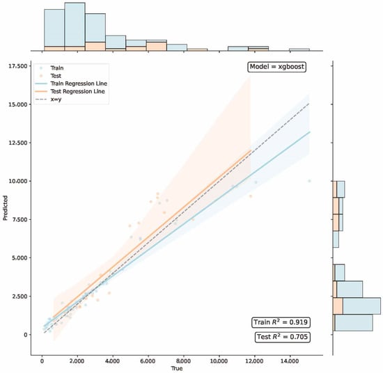 To verify the performance of the XGBoost model, multiple commonly used ML models were established for comparison, including the GBDT model, the RF model, the Adaboost model, and the traditional logistic model (Table 3, Figure 4). The results indicate that the accuracy of the XGBoost model surpasses that of the other ML models. The XGBoost model achieves a prediction R2 of 91.9%, demonstrating excellent performance with minimal differences between training and testing errors.